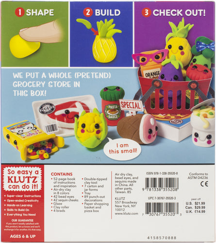 Make a super cute supermarket! Create more than 20 cute clay characters from every aisle of the grocery store: meat, produce, frozen food, and canned goods. Then make a papercraft shopping basket to tote them around. Crystal-clear instructions show what clay measurements you need and custom foam shapes make challenging projects easier-just wrap the clay around them! Sprinkled throughout are plenty of ideas to customize your grocery haul with cute food labels and packaging. Don't forget your shopping list! This 8x9x1.5 inch package contains one 52-apge book of instructions and inspiration, air-dry clay in eight colors, 42 bead eyes, 42 sequins cheeks, glaze, clay roller and four brads. Conforms to ASTM D 4236. Recommended for ages 6 and up. Imported.
