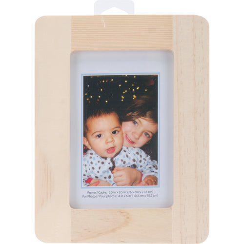 MULTICRAFT-Natural Pine Frame. A gorgeous natural wood frame that can be displayed as-is or decorated and embellished to match your personality and home decor. It holds one 4x6 inch photograph, the border around the photo measures 1-1/4 inches wide. It can be used eit her horizontally or vertically: there are two small holes on the back side for the support peg. This package contains one 6-1/2x 8-1/2x1/2 inch frame and one 3 inch long support peg. This frame does not come with any protective insert to cover the photograph. Imported.