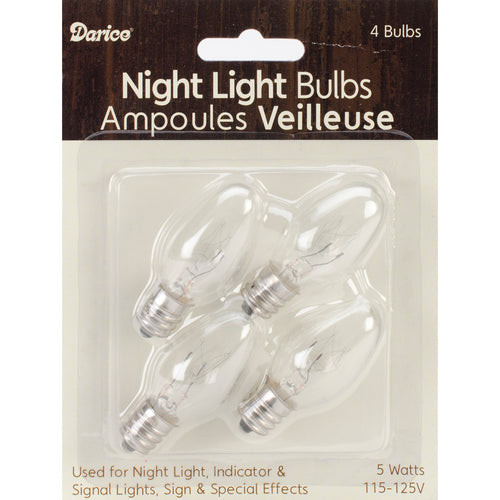 Darice-Night Light Bulbs. Crafters can create year round projects to coordinate with room decor as well as unique gifts. Can be used for a night light, indicator, signal light, sign and special effects. This 4.25x5.5 inch package contains four 5w (115-125V) night light bulbs. WARNING: This product contains chemicals known to the state of California to cause cancer, birth defects or other reproductive harm. Do not mouth or chew. Imported.