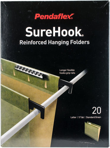 Pendaflex(R) SureHook(R) reinforced hanging folders feature longer plastic hooks with built-in tension springs that prevent them from falling into file drawers. The durable 11 pt. covers won't buckle under pressure. Includes an 8.5X11 inch printer-ready label sheet and clear tabs for placement in five positions. Paper made from 10% recycled fiber with 10% post-consumer fiber. This package contains 20 letter size standard green Pendaflex(R) SureHook(R) reinforced hanging folders. Made in USA.