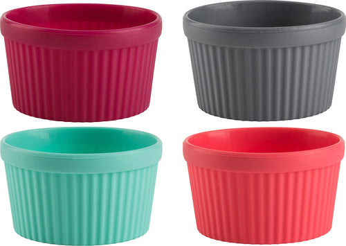 Silicone offers non-stick properties and flexibility for easy release. Ideal for souffles, creme brulees, appetizers, sauces, dips and more. Heat resistant silicone up to 428 degrees. Dishwasher safe. BPA free. This 3x3-3/4x3in package contains four 2-3/4in multicolored silicone ramekins. Imported.
