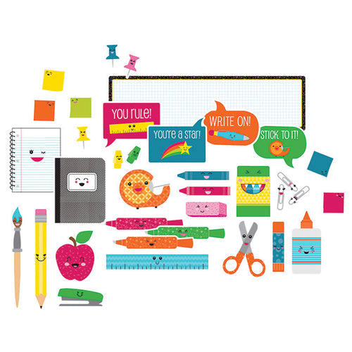 Add a cheerful splash of color to your classroom with the 59-piece School Pop School Tools mini bulletin board set. This set features brightly colored sticky notes that can be personalized with students' names, plus colorful school tools like crayons, notebooks, and scissors with smiling faces. Add style and substance to small classroom spaces with mini bulletin board sets. The smaller pieces provide great accents for doors, centers, small bulletin boards, and windows. Designed for versatility, these pieces are perfect to create decorative, classroom management, or motivational classroom displays. Use the pieces together to create a single display or spread them out to create multiple displays. Be sure to look for coordinating products to create a cohesive classroom theme!