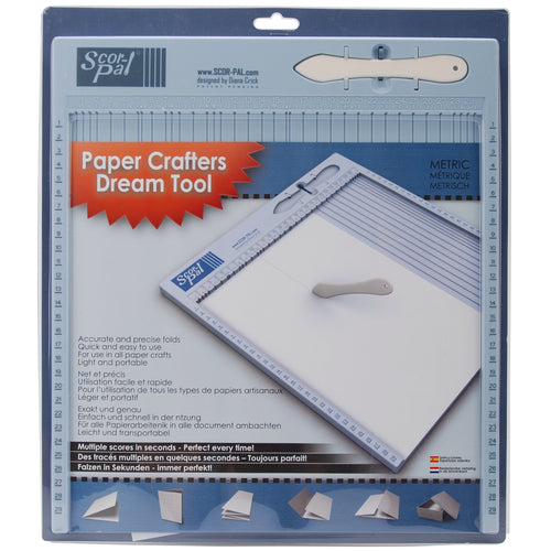 SCOR-PAL-Metric Measuring & Scoring Board. This board and Scor-tool allows you to make perfect scores for precisely folded greeting cards, envelopes and more. With it's one piece plastic construction with a convenient tool holder it is lightweight and easy to travel with. This board is great for all kinds of paper crafting projects: scrapbooking, greeting card making, paper boxes, envelopes and much more! Board measures 14-1/4x12-3/4in and has a measurement grid down both sides in centimeter increments and across the top in 1/2 centimeter increments featuring special symbols that along with the instructions make card folding easier than ever! Imported.