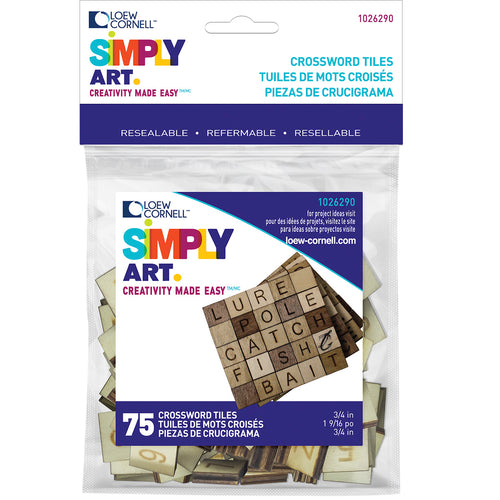 Loew-Cornell-Simply Art Wood Letter Tiles: Brown. These embellishments are the perfect addition to all of your crafting projects. This package contains seventy-five 3/4x3/4 inch wood crossword tiles with assorted numbers and letter on each. Imported.