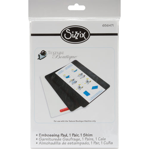 SIZZIX-Texture Boutique Embossing Pads. Use this durable embossing accessory made specifically for Sizzix Textured Impressions Embossing Folders in the Sizzix Texture Boutique Embossing Machine (not included). These 4-7/8x7-1/8in pads precisely compensate for the proper pressure and height required for pressing thin material surfaces such as paper, cardstock and foil to make a lasting impression. Use the included Mylar Shim if necessary for deeper, more complete embossing. Imported.