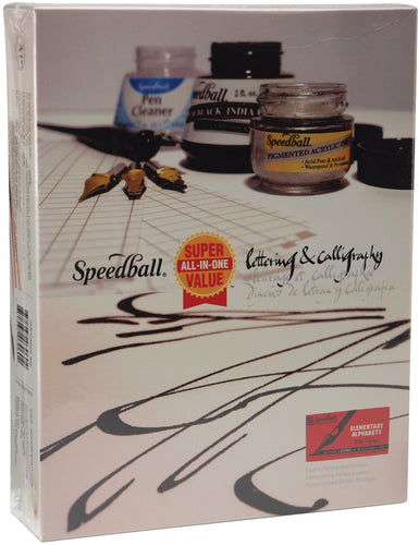 SPEEDBALL-Super All-In-One Lettering & Calligraphy Set. Includes the essentials needed to get started in lettering and calligraphy. Perfect for beginners, students or calligraphers. Fun and easy to use. Perfect for scrapbooks, journals, drawing, sketching, and much more. Kit contains: Kit includes one each of the following: C1 nib, C2 nib, B4 nib, A5 nib, penholder, 2 oz. Super Black India Ink, 12 ml metallic silver calligraphy ink, 2 oz. highly effective pen cleaner, practice paper, Speedball Elementary Alphabets Instructions booklet. Measurements: 8-3/4x6-3/4x2 in. Made in USA.