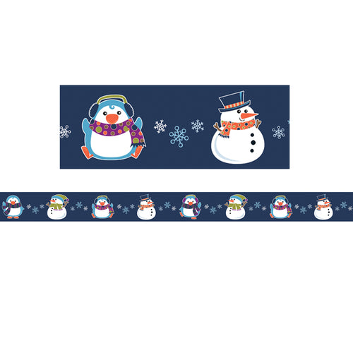 Add a cool, charming touch to your classroom with the Winter Fun straight border. This border features assorted snowmen, penguins, and snowflakes on a navy blue background for a design to celebrate the season! A simple solution for accenting classroom displays, bulletin boards, windows, and doors, straight borders provide an easy, affordable way to create a colorful classroom. Each pack features 12 strips that measure 3 feet x 3 inches for a total length of 36 feet. Use these borders individually or cut and layer them to create your own special style. Be sure to look for other coordinating products to create a cohesive classroom theme!