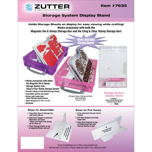 Zutter-Magnetic Die & Stamp Sheet Easel Holder Display Stand. Holds storage sheets on display for easy viewing while crafting! Works exclusively with both the magnetic die and stamp storage box and the cling and clear stamp storage box (sold separately). This package contains one 12-1/4x8-1/2 inch easel. Imported.