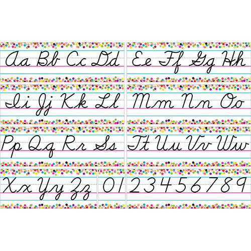 Display the alphabet and numbers 0“9 as a handy reference for young students. The 4-page teacher's guide includes writing tips. Includes 9 panels for over a 17-foot long alphabet line. Each 4-letter panel is 23-1/2" x 7-1/2".