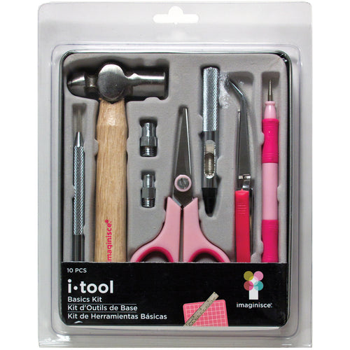 IMAGINISCE-iTool Basics Kits. This kit contains a variety of the basic tools and supplied needed by scrapbookers and paper crafters. Included in the set are a paper piercer, a hammer, an eyelet setter with two tips, a pair of scissors (1-1/2 inch long blades), a pair of reverse-action tweezers, a dual-tip embossing tool, a 4x4 inch crafting mat, and a 6 inch long metal ruler. All items come housed in a convenient 7x5-3/4 inch metal storage tin. Imported.