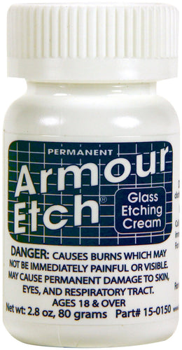 Great for etching small areas of glass. This 1.5x3.1x1.5 inch package contains 2.8 ounces of permanent glass etching cream. Will not etch plastic or some Pyrex. DANGER: Causes burns which may not be immediately painful or visible. May cause permanent damage to skin, eyes, and respiratory tract. Recommended ages 18 years and up. Made in USA.
