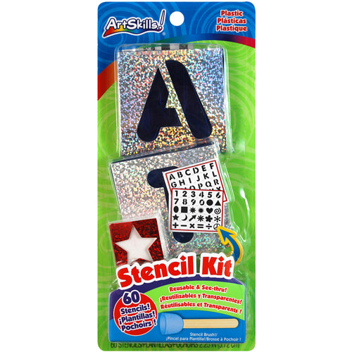 ARTSKILLS-Letters, Numbers & Shapes Stencil Kit. These stencils are reusable, and the great part is that you can color in each stencil how you want for your project. This package contains one set of sixty plastic letters, numbers, punctuation, symbols and shape stencils, a foam stencil brush, a centering ruler, and an eraser. Conforms to ASTM D 4236. Imported.
