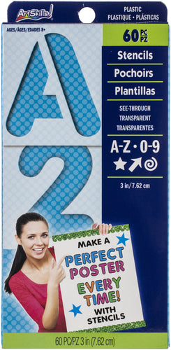 ARTSKILLS-Reusable Stencils Use these fantastic pieces to create a really cool and unique poster project! Each stencil is 3 inches tall, is see-through and is reusable. This package contains sixty plastic stencils (one set of letters, one set of numbers and one set of punctuation, symbols and shapes). Conforms to ASTM D 4236. Imported.