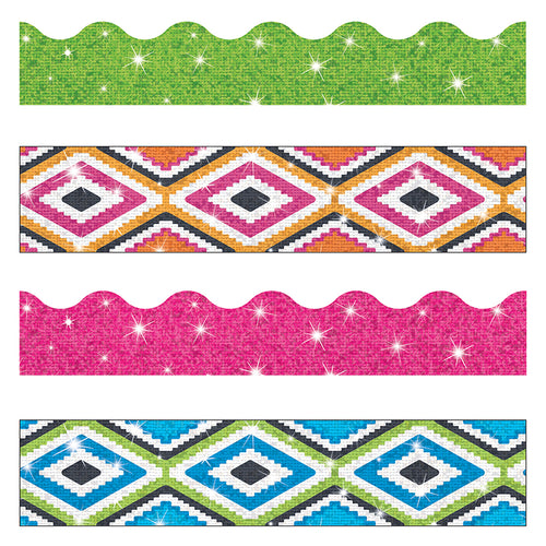 Spruce up your classroom and kick up the fun with brand new combo packs of Terrific Trimmers and Bolder Borders, ready to brighten your walls, create eye-popping displays, enhance themed events, and more. Layer patterns on solids, sparkles, or metallics for extra WOW! Includes Lime Sparkle Terrific Trimmers, Aztec Blue Sparkle Plus Bolder Borders, Aztec Orange Sparkle Plus Bolder Borders, and Hot Pink Sparkle Terrific Trimmers. 130' total.