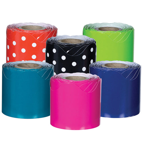 Frame, highlight, and trim your classroom throughout the year with the Rolled Scalloped Border Set 2. Rolled border sets provide a variety of ways to decorate any area of your classroom. Use these borders to frame doors, windows, shelves, artwork, bulletin boards, and more. Easy to customize, rolled borders are perfect to use individually, or cut and layer them to create your own style. Each continuous roll of scalloped border measures 2.25" x 36', for a grand total of 216 feet per set. This set includes these rolled scalloped borders: Black and White Dots, Red and White Dots, Lime, Teal, Hot Pink, and Navy.