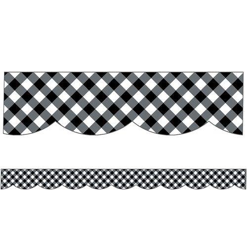 Give your bulletin board displays the perfect finishing touch with eye-catching border trim. The Woodland Whimsy Black & White Gingham Scalloped Borders pack includes 13 border strips, each measuring 3' x 3" for a total length of 39'.