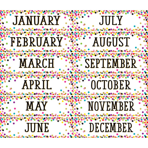 Confetti Monthly Headliners add instant appeal to any classroom! Use them as titles for bulletin board displays. Line them up along a wall or above a chalkboard. Create classroom calendars. 12 headliners per pack. Each headliner measures 5" x 18".
