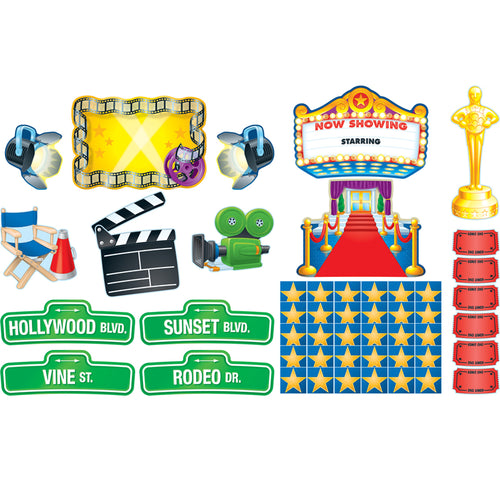 When you decorate your classroom with the Lights, Camera, Action! bulletin board set, you set the stage for success! Featuring an old Hollywood theme, this bulletin board set includes everything you need to transform your classroom into a red carpet premiere: 1 film reel header (16.25" x 11.25"), 2 spotlights (7" x 7.75"), 1 movie camera (10" x 8"), 1 director's chair with megaphone (9.25" x 10"), 1 clapboard (9.5" x 11" assembled), 1 statuette award (6" x 16.25"), 1 red carpet (15.5" x 11.75"), 1 marquee (16.25" x 11.25"), 1 "Now Showing" text (11.25" x 1.5"), 1 "Starring" text (4.75" x 1"), 6 movie tickets (5.75" x 3.25"), 4 street signs (16.25" x 5.5"), 30 walk-of-fame stars (3.5" x 3.5"), and resource guide.