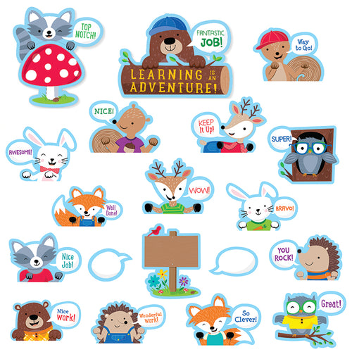 The 21-piece set contains 16 peek-over animal pieces with motivational phrases, two blank speech bubbles, a "Learning is an Adventure" sign, a toadstool accent and a blank sign. Animals featured in the set include: raccoon, rabbit, bear, deer, fox, owl, squirrel, and hedgehog. Each animal includes a motivational phrase such as "Nice Job!", "Bravo!", "Awesome!", "Well Done!", and "Wonderful Work!"