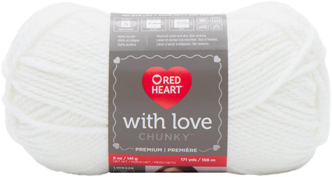 RED HEART-With Love. A premium acrylic worsted weight yarn. This yarn wins all hearts for its softness and sheer touchability. It comes in over 30 beautiful shades of mixable multis and no-dyelot solids. Weight category: 4. Content: 100% acrylic. Putup: Solids- 7oz/198g, 370yd/338m. Multis