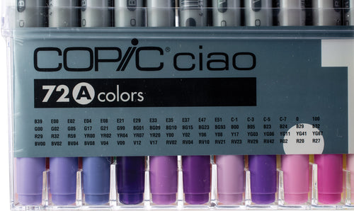The perfect entry level marker-a great color selection and a lower price! Ciao markers feature a super brush nib on one end and a medium broad nib on the other: perfect for beginners! Solid polypropylene body is both smooth and comfortable for a perfect controllable grip. These double ended markers with durable polyester nibs come with a Super Brush and Medium Broad nibs. They will not damage paper when blending and layering colors. Markers are refillable, low-odor, blendable and for use on paper, leather, wood, fabric, plastics, faux fur and more. Ciao markers have a 3-year shelf life and are guaranteed for color consistency. Not compatible with the Copic Airbrush System. No duplicate colors between sets. This package contains one durable 6x5.125x2.5 inch acrylic storage/display box with 72 markers. Imported.