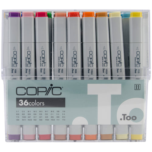 COPIC MARKER-Basic Marker Set. Excellent for all forms of illustration, design, scrapbooking, fine art and more. They have an alcohol-based ink that is permanent, non-toxic, low odor and acid- free. This package contains thirty-six basic Copic marker colors in one 5-3/4x6-1/2x3 inch case. Comes in multiple sets. Each sold separately. Conforms to ASTM D 4236. Imported.