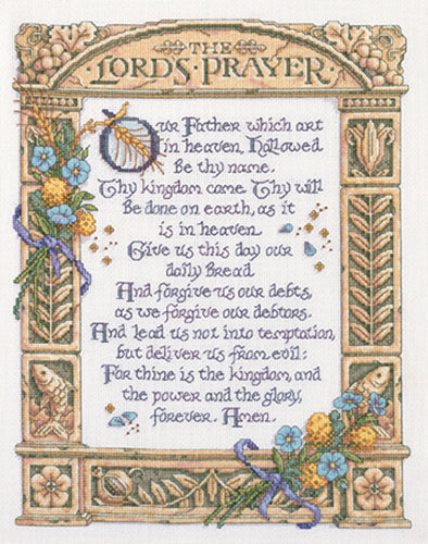BUCILLA-Counted Cross Stitch Kit. This fabulous kit was designed to take your breath away. The timeless appeal will give you inspiration for years to come. Kit includes: 14 count white Aida, cotton floss, needle, and tri-lingual instructions and chart. Approximate finished size:14.5Hx11.25W. Design: The Lord's Prayer. Designer: Sandy Orton. Made in USA.