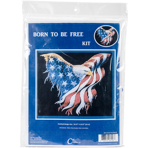 Cody Country-Counted Cross Stitch Kit. Unique, quality patterns that are one-of-a-kind patriotic and Christian designs! Only full and back stitches are used in these designs. This package contains 14 count black fabric, floss, one needle, one layout page and easy to follow instructions. Design: Born To Be Free. Finished size: 14- 1/2x16-1/2 inches. Made in USA.