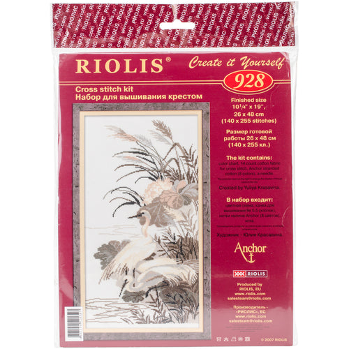 RIOLIS-Counted Cross Stitch Kit. RIOLIS creates magnificent designs in classical and modern styles ideal for both beginners and experts alike! Many designs originate from renowned contemporary artists. This package contains 14 count white Zweigart Aida fabric, Anchor stranded cotton in eight colors, one needle, instructions and a color chart. Finished Size: 10.25x19 inches. Design: Herons. Imported.