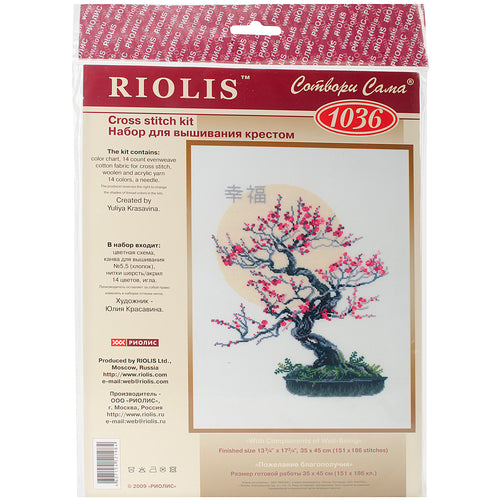 RIOLIS-Counted Cross Stitch Kit. Express your love for arts and crafts with these beautiful cross stitch kits! Find a themed kit for any taste! This package contains 14 count white Zweigart Aida fabric, Safil wool/acrylic yarn in fourteen colors, one color chart and one needle. Design: Bonsai Of Sakura Wish Of Well Being. Finished Size: 13.75x17.75 inches. Imported.