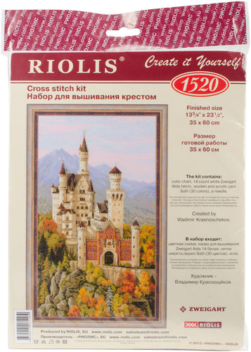 RIOLIS-Counted Cross Stitch Kit. Express your love for arts and crafts with these beautiful cross stitch kits! Find a themed kit for any taste! This package contains 14 count white Zweigart Aida fabric, Safil wool/acrylic yarn (thirty colors), one needle, instructions and color chart. Design: Neuschwanstein Castle. Finished size: 13.75x23.5 inches. Imported.