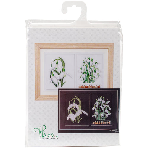 Thea Gouverneur-Aida Counted Cross Stitch Kit: 18 Count. Inspired by nature, these kits are detailed using a variety of colors with results that are realistic and true to nature! This package contains one 8-1/2x13 inch piece of Aida cloth, pre-sorted DMC floss, one John James needle, one easy-to-follow chart and instructions in English. Design: Snowdrops Panel. Imported.