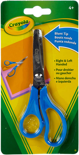 CRAYOLA-Blunt Tip Kids Scissors. Comfortable, left and right handed. The Crayola line of scissors has been specifically developed to meet the cutting needs of kids. The Blunt Tip Scissors have rounded points with tough stainless steel blades which are made to last. Crayola scissors also have uniquely designed handles that allow kids to use multiple fingers for greater comfort. They are self-adjusting which evens out tension to cut cleanly and effortlessly. Made in Taiwan.