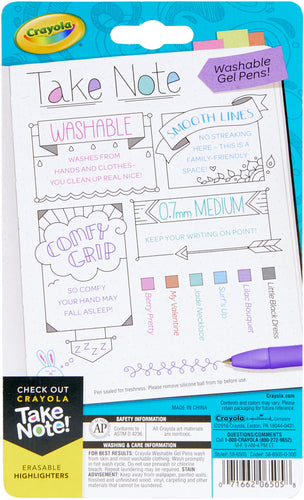 Create vibrant art and notes with Take Note! washable gel pens from Crayola. This 4.25x7.5 inch package contains six washable gel pens in colors pink, red, turquoise, blue, purple and black. Recommended ages six years and up. Conforms to ASTM D4236. Imported.