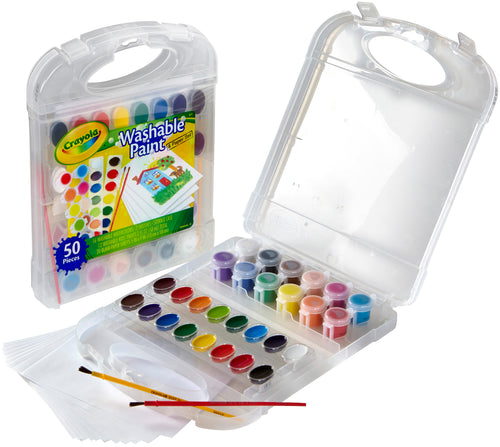 Crayola-Washable Paint & Paper Set. The durable, portable, all-in- one storage case is perfect for travel! This 11x9x1-1/4 inch package contains sixteen washable watercolors, twelve washable kids paint, two brushes, and twenty blank paper sheets. Recommended for ages 4 and up. WARNING: Choking Hazard- small parts. Not for children 3 years and under. Conforms to ASTM D 4236. Imported.