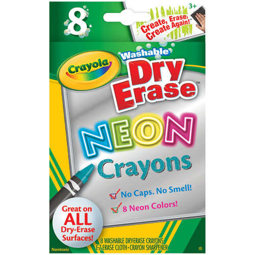 Washable Dry-Erase Crayons in 8 vibrant neon colors! Erases cleanly but won't easily brush off dry-erase surfaces. Washes easily from skin and fabrics. No odor, no caps to lose and they won't dry out. Includes built-in sharpener. Each pack includes 8 Washable Dry-Erase Neon Crayons, Sharpener and E-Z Erase Cloth.