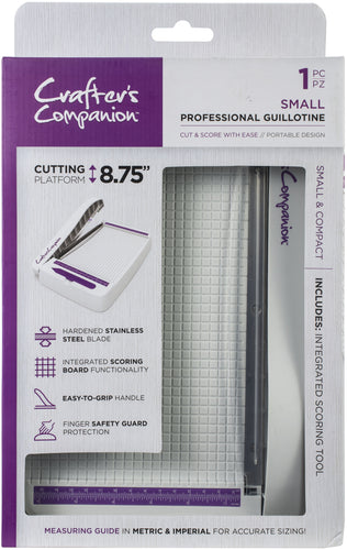 The Crafter's Companion Professional Guillotine has an easy-to-grip handle, hardened stainless steel blade, finger guard, scoring tool and a metric and imperial measuring guide. It is white with purple accents and measures 8.58 x 12.4 inches. The platform measures 6.25 x 8.75 inches and includes score lines .25 inches apart for precise accurate scoring. Package measures 9 x 14.75 x 2.75. Age Recommendation of 18 and up. Blade is very sharp. Clean each side of the blade with a damp cloth. Dry thoroughly. Imported.