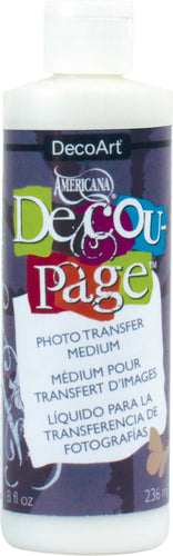 Deco Art-Americana Decou Page Photo Transfer Medium. You're your photos a unique look by transferring to paper and more! Transfers black and white, or color copies to wood, glass, plastic, fabric and more! For best results, use images made on a laser printer or copier using lightweight paper. This package contains one 8oz bottle of photo transfer medium. Conforms to ASTM D 4236. Made in USA.