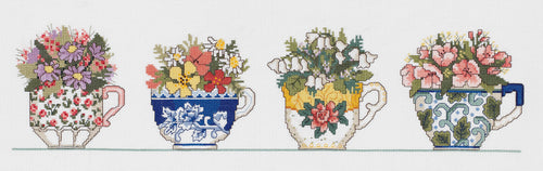 JANLYNN-Counted Cross Stitch Kit. Creative designs and quality products are put in to each of Janlynn's kits. This kit contains 14 count white Aida, 6-strand 100% cotton floss, needle, graph, and instructions. Design: Row Of Teacups. Finished dimensions: 5x20 inches (mat and frame are not included). Made in USA.