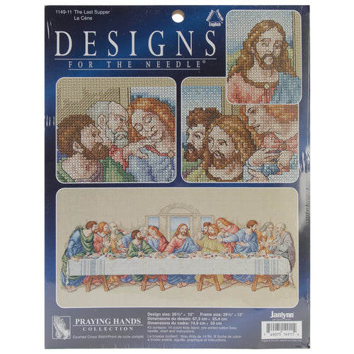 JANLYNN-The Last Supper. Counted Cross Stitch. Stitch this awesome and inspiring portrayal of Jesus and the twelve disciples breaking bread. Kit contains: 14-count 100% smoke color 100% cotton Aida fabric, 6-strand cotton floss, needle, chart and multi-lingual instructions. Design size: 26.5x10 inches. (mat/frame not included).
