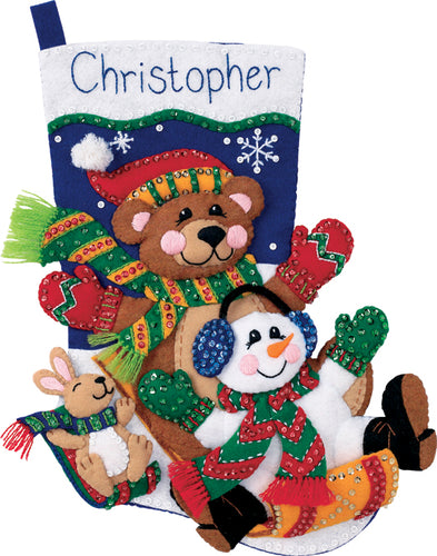 DIMENSIONS-Felt Applique Stocking Kit. Everything you need to complete this bright, fun, and festive stocking is in this kit. Kit includes: printed felt, embroidery thread, acrylic yarn, sequins, beads, and easy step-by-step instructions with an alphabet for personalizing. Finished size: 18 inches. Design: Toboggan Trio. Designer: Todd Trainer. Imported.