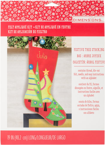 Dimensions brings to you beautifully designed images in a vast variety of themes from baby to weddings, sympathy to inspirational and fun and quirky to seriously sentimental. This package contains thread, die-cut felt, needle, and easy instructions with an alphabet for personalizing. Finished size: 19 inches long. Design: Festive Tree Stocking. Imported.