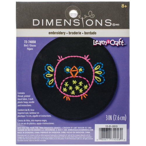 Dimensions-Learn A Craft: Owl Stamped Embroidery Kit. Learn a classic art! This collection of needle art kits is perfect for beginners with their simple yet fun designs. This package contains one 3 inch round plastic embroidery hoop, printed black fabric, cotton thread, needle and easy to follow instructions designed for a beginner. Finished size: 3 inches. Design: Owl. Designer: Dimensions. Recommended for ages 8 and up. WARNING: Choking Hazard- small parts and sharp objects. Not for children under 3 years. Imported.