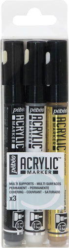 Markers contain an acrylic water and pigment-based paint. Available in assorted tip sizes, they have a pump mechanism that allows more or less paint to pass through the nib, therefore allowing precise dosage when applying paint to the surface. They offer opacity, high pigmentation and permanence, it is an acrylic paint tool ideal for all types of applications. This 1.875x5.75x.625 inch package contains three 1.2mm acrylic markers in assorted colors. Conforms to ASTM D 4236. Imported.