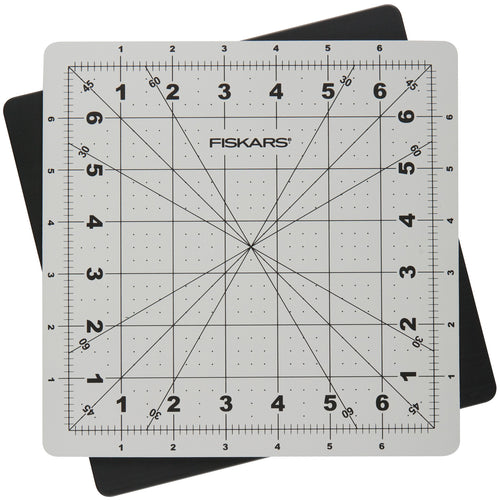 FISKARS-Rotating Cutting Mat. This compact 8x8 inch cutting mat fits your project tote and rotates to help you cut and trim fabric at easier angles. The self-healing mat provides a cutting sirface that lasts longer than others and has an easy-to-read measuring grid to make accurate measurements a snap. 30-, 45- and 60-degree bias lines make creating triangle and star shapes easy. Includes one 8x8 inch cutting mat. Lifetime warranty.