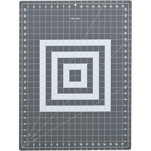 Fiskars-Self Healing Rotary Cutting Mat. The ideal size for cutting full widths of fabric right off the bolt. It features a self- healing mat with measuring grids on both sides for double the usage. Includes 30, 45 and 60 degree bias lines that make shape cutting and cutting at angles a breeze. This package contains one 24x18 inch double-sided self-healing gray rotary cutting mat with a 1 inch grid and 30, 45, and 60 degree markings. Imported.