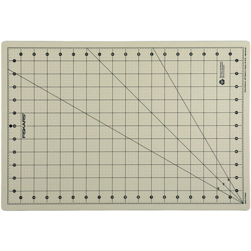 FISKARS-Self-Healing Cutting Mat. This double-sided cutting mat gives you twice the cutting life! Both sides have 1-inch grid lines with dotted lines at 1/4 inch increments. All four edges have rulers with 1/8 inch increments and there are also 30- 45- and 60-degree angle lines The cutting grid area measures 12x18 inches and the overall size of the mat is 13x19 inches. This package contains one self-healing cutting mat. Made of 100% polypropylene. Imported.