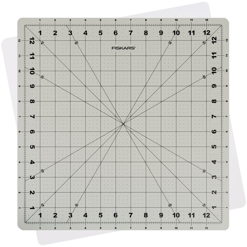 Fiskars-Self-Healing Rotating Cutting Mat. Cutting mat rotates 360 degrees to easily trim all four sides of a block without repositioning fabric! Promotes safe handling of the rotary cutter- no awkward cuts. Has a black and gray self-healing cutting surface with easy-to-read graphics. This package contains one 14x14 inch healing rotating cutting mat that makes squaring 12-1/2 inch square blocks easy. Comes with its own re-usable storage bag with handles. Imported.