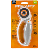 Fiskars-Easy Blade Change Titanium Rotary Cutter. Ideal for cutting multiple layers of fabric, paper, felt and vinyl! The titanium blade coating is three times harder than steel. Has a soft grip handle for added comfort. This package contains one rotary cutter with a 45mm easy blade. Works with the no-touch blade change tool (sold separately). Imported.