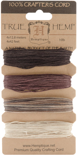 HEMPTIQUE-Hemp Cord. Natural Hemp Cord is the preferred choice for use in crafts including jewelry making, scrapbooking, handmade cards, gardening and more! Hemp Cord is a natural biodegradable and eco-friendly alternative to cotton and synthetic cordage. This package contains an assortment of 10-lb Hemp Cord: 3.2 meters (10-1/2 feet) each of four different colors